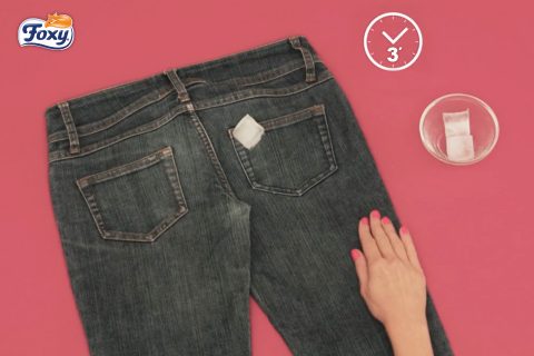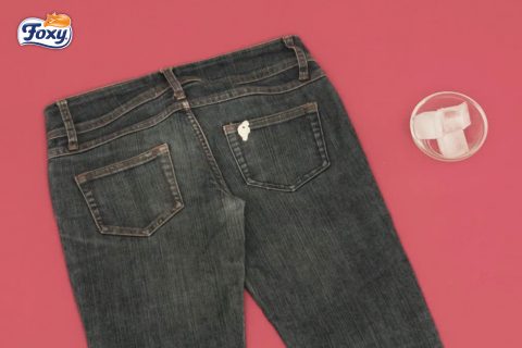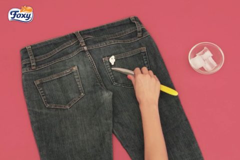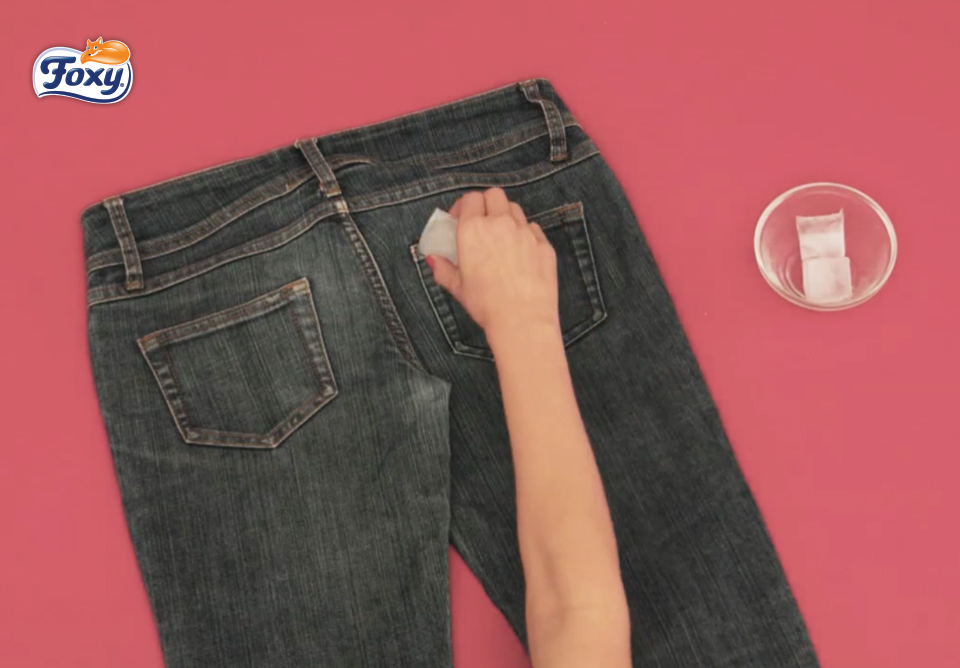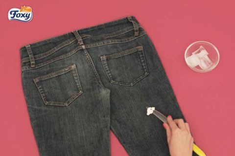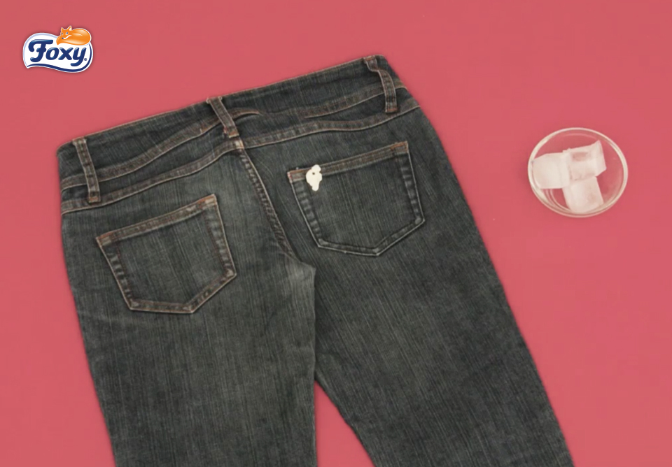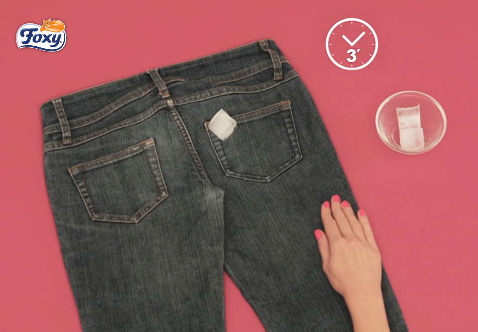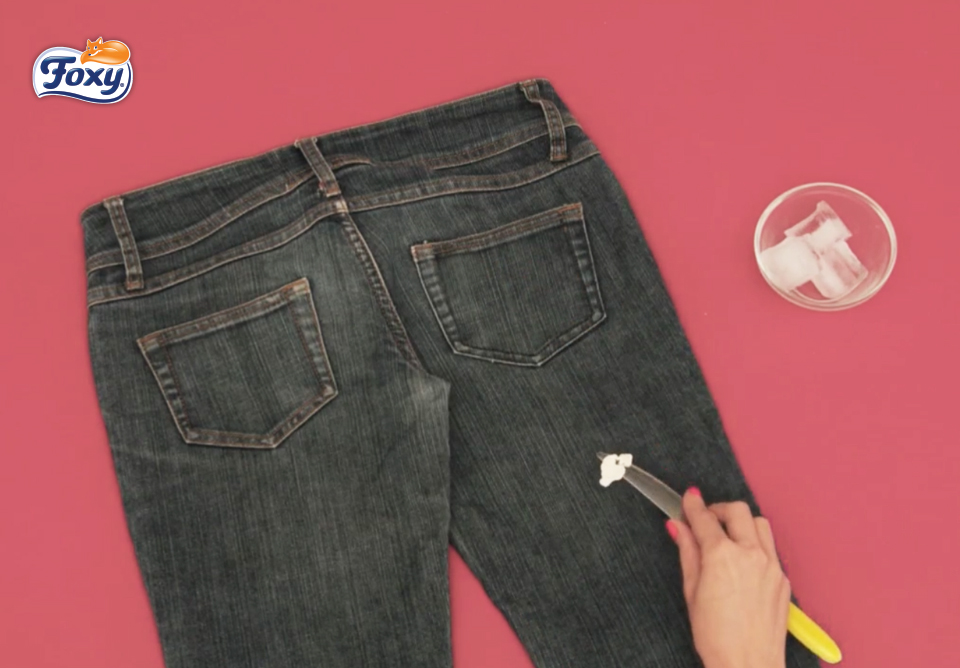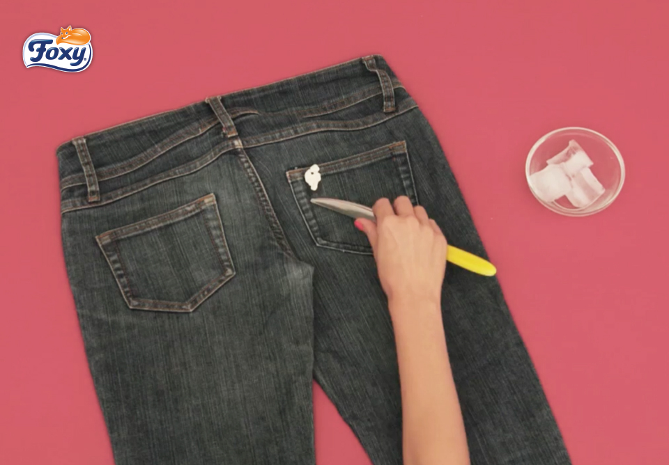 Με ένα παγάκι και ένα μαχαίρι (ή ένα λεπίδι, σουγιά κ.ά.) απομακρύνουμε από το τζιν παντελόνι (ή φούστα ή πουκάμισο…) την κολλημένη πάνω σε αυτό τσίχλα.